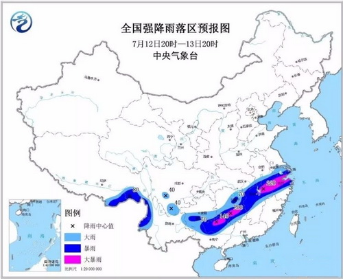 预计,7月12日20时至13日20时,江苏南部、上海、安徽南部、湖北东南部、浙江中北部、江西中北部、湖南中南部和东北部、广西北部、贵州中南部、云南西部、西藏东南部等地的部分地区有大到暴雨,其中,安徽东南部、浙江北部、江西东北部、湖南南部、广西东北部等地局地有大暴雨(100~220毫米),上述部分地区伴有短时强降水(最大小时降水量20~50毫米,局地可达70毫米以上)、局地有雷暴大风等强对流天气。